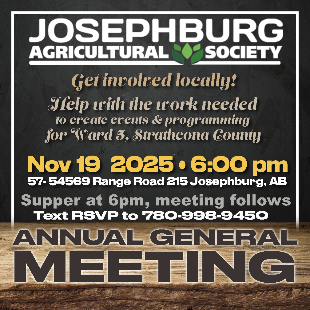 JAS AGM 2025 on November 19, 2025 Posted on November 2, 2025November 3, 2025 by Admin Plan to attend the 2025 Josephburg Ag Society AGM at the Josephburg Community Hall on November 19, 2025. A catered supper at 6 pm with the meeting to follow. Please TEXT an RSVP with your name and number attending to 780-998-9450 before Nov 14, 2025 Share: Recommend on Facebook Buzz it up Tweet about it Tell a friend