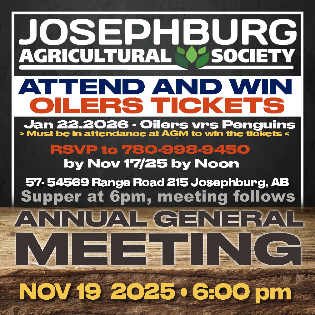 JAS AGM 2025 on November 19, 2025 Posted on November 2, 2025November 14, 2025 by Admin Plan to attend the 2025 Josephburg Ag Society AGM at the Josephburg Community Hall on November 17, 2025. A catered supper at 6 pm with the meeting to follow. Please TEXT an RSVP with your name and number attending to 780-998-9450 before Nov 17, 2025 Share: Recommend on Facebook Buzz it up Tweet about it Tell a friend